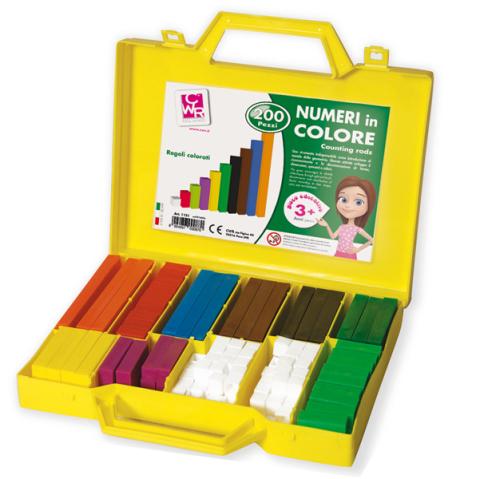 Descrizione / dati tecnici: Strumento per l'insegnamento dei primi concetti matematici ai bambini. Si appredono le equivalenza, le associazioni valore numerico/colore, i primi calcoli aritmetici.