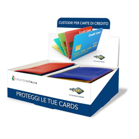 Descrizione / dati tecnici: Espositore con porta carte di credito, schede telefoniche, tesserini di riconoscimento, nuovepatenti,viacard,tessere ACI, etc. In PVC morbido colorato.