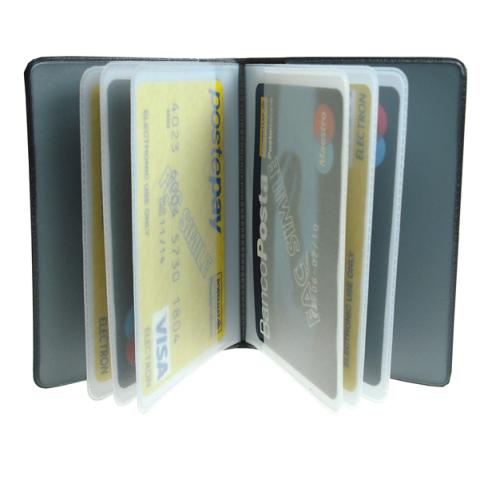 Descrizione / dati tecnici: Portacard in pvc espanso sergè spessore 1,2 mm a libro a 14 scomparti, tasche interne in pvc antistatico, stampa a caldo in argento opaco.