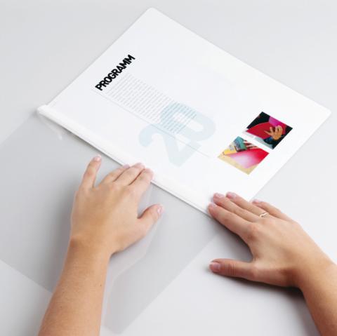 Descrizione / dati tecnici: Cartelline bianche per rilegatura rapida mediante punti metallici. In PVC con copertina frontale trasparente e posteriore colorata. I punti vengono coperti dalla banda adesiva colorata posta su ambo i lati della cartellina. Dotate inoltre di asole per l'archiviazione in raccoglitori ad anelli. Capacità 1-30 fogli A4. Formato utile: 21x29,7cm.