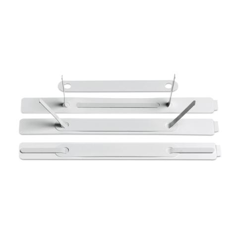 Descrizione / dati tecnici: Pressino in ABS adesivo bianco con linguette in metallo. Scatola 100 pressini.