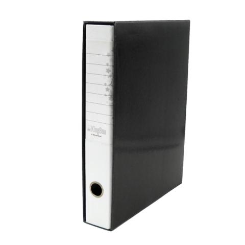 Descrizione / dati tecnici: KingBox è un registratore indeformabile, lavabile e duraturo nel tempo, in cartone accoppiato da 2 mm di spessore, con rivestimento in resistente polipropilene goffrato. Dotato di propria custodia in cartone accoppiato nero, con bordi rinforzati, e di meccanismo a leva di alta qualità ancorato saldamente mediante 4 rivetti. Per agevolare la presa e facilitare l'archiviazione, KingBox presenta un anello di estrazione in acciaio nichelato (diametro 25 mm) ed una etichetta personalizzabile/scrivibile all'interno di una comoda busta termosaldata in PVC trasparente (170x100 mm), interamente fasciante il dorso.