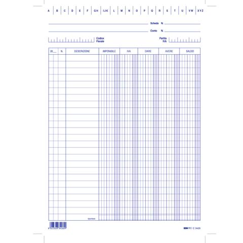Descrizione / dati tecnici: 100 schede in cartoncino da 170gr. Formato 24x17cm verticale. Dare/avere/saldo.