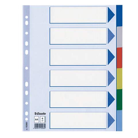 Descrizione / dati tecnici: Separatori in Polipropilene colorato dotati di 6 tasti neutri multicolore. Indice frontale prestampato realizzato in cartoncino e rinforzato in Mylar sul lato forato. Perforazione universale. Formato A4.
