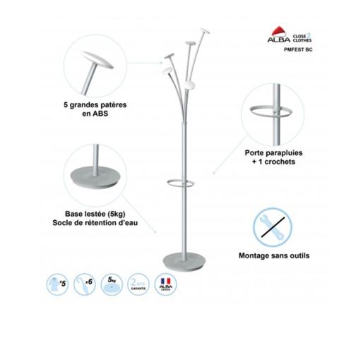 Descrizione / dati tecnici: Appendiabiti in acciaio e abs con base appesantita. Dotato di 5 supporti abito e portaombrelli con raccogli acqua. Dimensioni: altezza 187cm base da 5kg con diametro 35,5cm