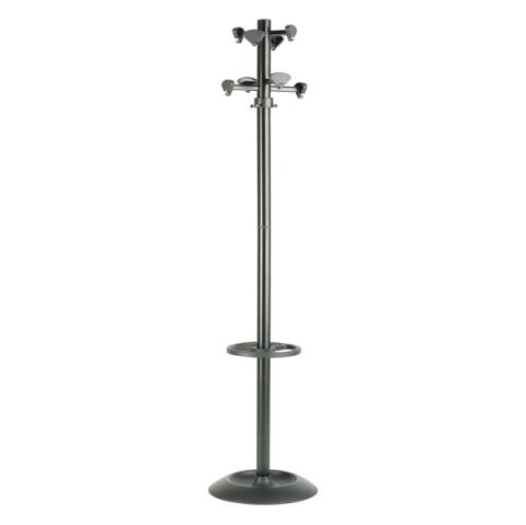 Descrizione / dati tecnici: Appendiabiti da terra con stelo in metallo. Base in plastica con vaschetta raccogligocce. Dotato di 8 supporti e portaombrelli. Testa girevole. Dimensioni: 175x39cm