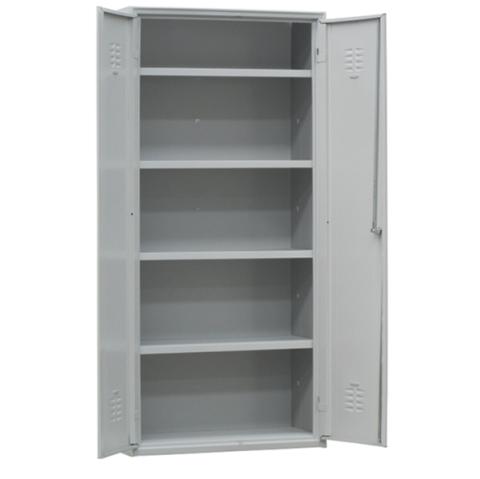 Descrizione / dati tecnici: Armadio multiuso a 2 ante battenti con struttura in lamiera d’acciaio profilata di prima scelta. Costituito da 1 vano da 4 ripiani interni rettangolari regolabili su asole in 8 posizioni differenti. Porta cartellino in materiale plastico applicato all’anta. Chiusura con serratura a cilindro con doppia chiave in dotazione. Fornito montato.