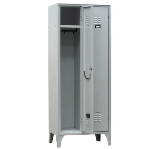 Descrizione / dati tecnici: Armadio tradizionale a 2 vani. Ogni vano è dotato di ripiano superiore con sottostante tubo ovale porta grucce in PVC completo di ganci scorrevoli non estraibili. Porta ombrello e vaschetta raccogli gocce su anta. Porta cartellino in materiale plastico applicato all’anta. Chiusura con serratura a cilindro con doppia chiave in dotazione. Fornito montato.