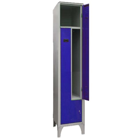 Descrizione / dati tecnici: Armadio spogliatoio monoblocco (elettro-puntato non assemblato) su piedi con doppia porta a “L” ogni colonna singola. Struttura portante realizzata in lamiera d’acciaio profilata prima scelta spessore 6/10. N. 2 ante contrapposte per colonna volte ad ottimizzare lo spazio, dotate di canottatura di rinforzo, di fori di aerazione e porta cartellino in materiale plastico. Vano calzature diviso da vano vestiario. Cerniere interne speciali antiscasso con perno di rotazione interno invisibile ad anta chiusa. Bordo frontale perimetrale arrotondato anti urto raggio mm 6 Nervature longitudinali su fianchi. Asole sul tetto per consentire un’ottima circolazione dell’aria. Trattamento delle superfici: a mezzo fosfato di ferro pesante come preparazione alla verniciatura che avviene per elettrodeposizione anodica con spessore garantito in ogni parte del mobile. Reticolazione a forno a 180°. Vernici: acriliche con elevata resistenza alla corrosione secondo le norme A.S.T.M.B. 117.64 e succ.var. DIMENSIONI cm: 40 X 50 X 195 H Peso: kg 24 Volume: mc. 0,39 4 vani – ripartizione interna del mobile per colonna: 1 ripiano a tutta larghezza 1 tramezzo divisorio centrale 1 ripiano inferiore a tutta larghezza Tubo ovale in PVC completo di ganci scorrevoli. Porta cartellino in materiale plastico applicato all’anta. Vano calzature diviso da vano vestiario per offrire maggior igiene. Colore corpo: grigio RAL 7035 Colore ante: blu RAL 5017 Serratura a cilindro con doppia chiave in dotazione.