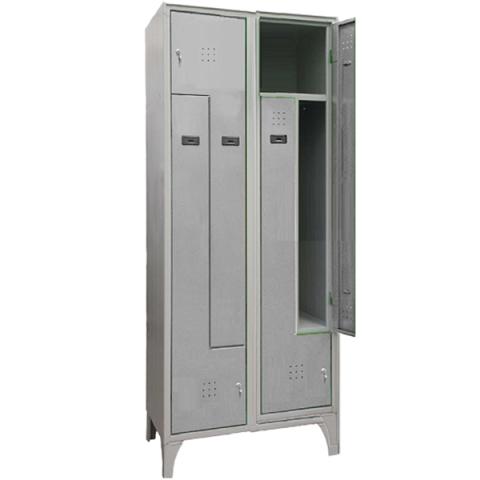 Descrizione / dati tecnici: Armadio spogliatoio monoblocco (elettro-puntato non assemblato) su piedi con doppia porta a “L” ogni colonna singola. Struttura portante realizzata in lamiera d’acciaio profilata prima scelta spessore 6/10. N. 2 ante contrapposte per colonna volte ad ottimizzare lo spazio, dotate di canottatura di rinforzo, di fori di aerazione e porta cartellino in materiale plastico. Vano calzature diviso da vano vestiario (maggior igiene). Cerniere interne speciali antiscasso con perno di rotazione interno invisibile ad anta chiusa. Bordo frontale perimetrale arrotondato anti urto raggio mm 6. Nervature longitudinali su fianchi. Asole sul tetto per consentire un’ottima circolazione dell’aria. Trattamento delle superfici: a mezzo fosfato di ferro pesante come preparazione alla verniciatura che avviene per elettrodeposizione anodica con spessore garantito in ogni parte del mobile. Reticolazione a forno a 180°. Vernici: acriliche con elevata resistenza alla corrosione secondo le norme A.S.T.M.B. 117.64 e succ.var DIMENSIONI cm: 80 X 50 X 195 H Peso: kg 43 Volume: mc. 0,78 Vani 8 – ripartizione interna del mobile per colonna: 1 ripiano a tutta larghezza 1 tramezzo divisorio centrale 1 ripiano inferiore a tutta larghezza Tubo ovale in PVC completo di ganci scorrevoli Porta cartellino in materiale plastico applicato all’anta Colore corpo e ante: GRIGIO RAL 7035 Serratura a cilindro con doppia chiave in dotazione.
