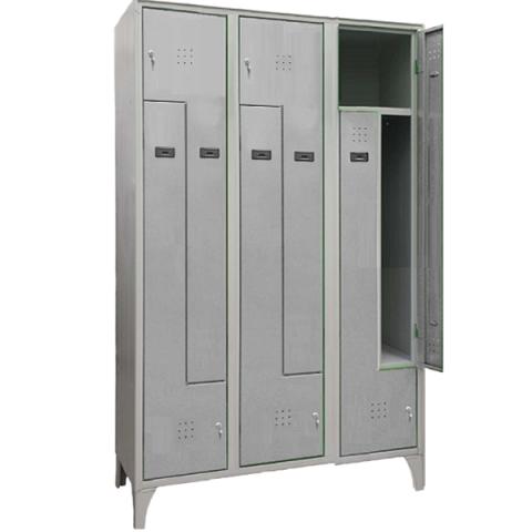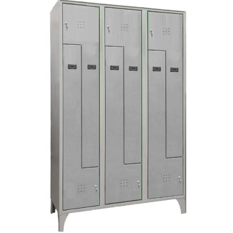 Descrizione / dati tecnici: Armadio spogliatoio monoblocco (elettro-puntato non assemblato) su piedi con doppia porta a “L” ogni colonna singola. Struttura portante realizzata in lamiera d’acciaio profilata prima scelta spessore 6/10. N. 2 ante contrapposte per colonna volte ad ottimizzare lo spazio, dotate di canottatura di rinforzo, di fori di aerazione e porta cartellino in materiale plastico. Vano calzature diviso da vano vestiario (maggior igiene). Cerniere interne speciali antiscasso con perno di rotazione interno invisibile ad anta chiusa. Bordo frontale perimetrale arrotondato anti urto raggio mm 6.Nervature longitudinali su fianchi. Asole sul tetto per consentire un’ottima circolazione dell’aria. Trattamento delle superfici: a mezzo fosfato di ferro pesante come preparazione alla verniciatura che avviene per elettrodeposizione anodica con spessore garantito in ogni parte del mobile. Reticolazione a forno a 180°. Vernici: acriliche con elevata resistenza alla corrosione secondo le norme A.S.T.M.B. 117.64 e succ.var. DIMENSIONI cm: 120 X 50 X 195 H Peso: kg 62 Volume: mc. 1,17 Vani 12 – ripartizione interna del mobile per colonna: 1 ripiano a tutta larghezza 1 tramezzo divisorio centrale 1 ripiano inferiore a tutta larghezza Tubo ovale in PVC completo di ganci scorrevoli Porta cartellino in materiale plastico applicato all’anta Colore corpo e ante: GRIGIO RAL 7035 Serratura a cilindro con doppia chiave in dotazione