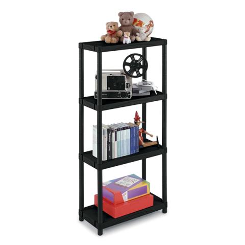 Descrizione / dati tecnici: Scaffali modulari in polipropilene a quattro ripiani con montanti, di colore nero. Portata di un ripiano 25kg uniformemente distribuiti, dimensioni: 60x30x132cm.