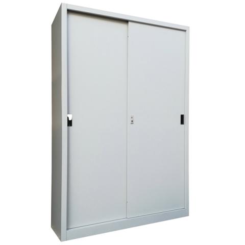 Descrizione / dati tecnici: Armadio per archiviazione ed ufficio con porte scorrevoli. Struttura portante realizzata in lamiera d'acciaio di prima scelta presso piegata di spessore 8/10. Le ante scorrono nelle guide del cappello mediante staffe zincate con cuscinetti a sfera rivestiti di nylon. Maniglie ad incasso in materiale plastico. Ripiani regolabili in altezza e predisposti per l'inserimento di cartelle sospese a lettura laterale di interasse 33 cm. Ripiani con portata di 50 Kg. cad