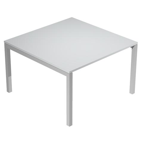 Descrizione / dati tecnici: Tavolo riunioni con piano 120 x 120 cm, in spessore 25 mm, con assenza di spigoli vivi, bordato in abs sp.2 mm. Realizzato in materiale melaminico, classe E1, con finitura antigraffio e antiriflesso. Struttura in metallo, con solida gamba di sezione 50x50 mm. in finitura grigio alluminio. Piano dotato di ampio passacavi rettangolare centrale.