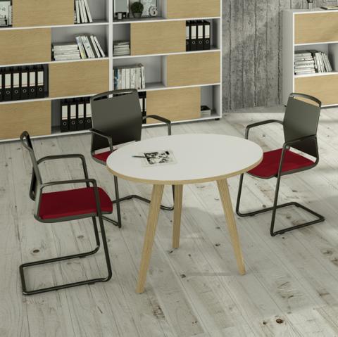 Descrizione / dati tecnici: Linea di arredo operativo dal design confortevole ed essenziale caratterizzata dalle preziose gambe in LEGNO MASSELLO inclinate delle scrivanie e dei tavoli rotondi. Robusti piani in melaminico sp. 22 mm con bordo antishock resistente agli urti in ABS 3 mm. Gambe in legno massello complete di piedini livellabili in altezza. Piani In materiale bilaminato nobilitato melaminico spessore 22 mm conforme norme UNI e EN classe E1.