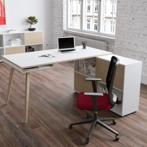 Descrizione / dati tecnici: Postazione compatta con ampio piano di lavoro sorretto da un lato da un pratico mobile di servizio portante a quattro vani completo di due ante scorrevoli e piedini regolabili in altezza e dall’altro da una coppia di gambe in legno massello con piedini livellabili in altezza. Nicchia porta oggetti/documenti sotto il desktop in corrispondenza delle gambe (aperta su due lati). Postazione reversibile destra/sinistra. Le ante possono essere assemblate sul contenitore sia lato scrivania che lato esterno del contenitore. Materiale bilaminato nobilitato melaminico spessore conforme norme UNI e EN classe E1, antigraffio ed antiriflesso.