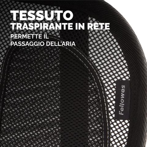 Descrizione / dati tecnici: In tessuto a rete con inserti di rinforzo, si adatta alla forma del corpo. Sistema di ancoraggio tri-tensioning per elimnare la necessità di continui aggiustamenti, facilmente adattabile alla sedia. Dimensione 50x45x20cm.