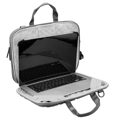 Descrizione / dati tecnici: Elegante borsa porta notebook realizzata in poliestere ecologico resistente all’acqua. Dotata di scomparto rivestito in morbido peluche progettato per adattarsi a qualsiasi pc o tablet di dimensioni fino a 16”. Ulteriore scomparto con tasca dedicata per powerbank. Porta di ricarica USB brevettata con design del cavo integrato. Tracolla regolabile inclusa. Dimensioni 30x42x4cm, peso 0,88kg.