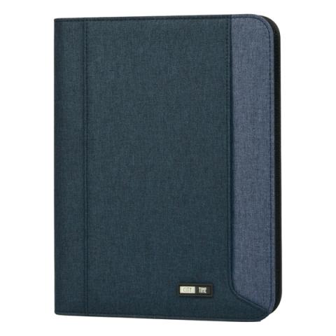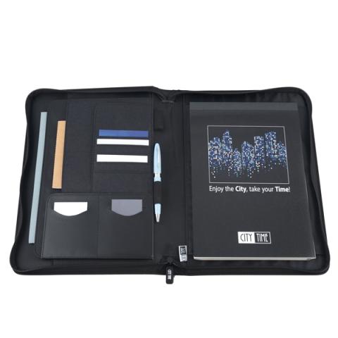Descrizione / dati tecnici: Portablocco in tessuto tecnico bicolore. Formato A4, chiusura con zip, scomparti per biglietti, tasca interna portadocumenti, portapenna, completo di blocco. Dimensioni 26x34cm.
