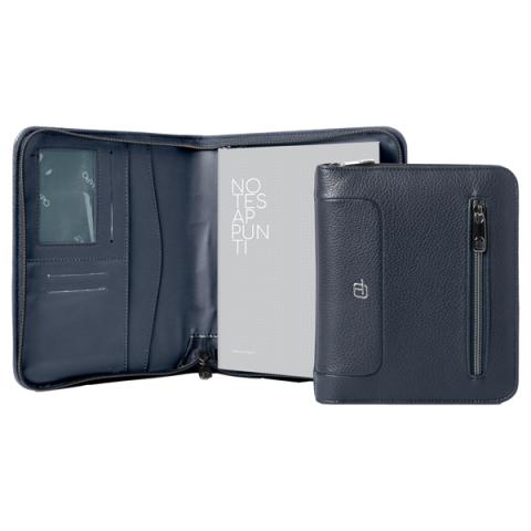 Descrizione / dati tecnici: Portablocco A5 con zip. Blocco notes verticale A5, scomparti per biglietti, asola porta penne e tasca esterna con zip.
