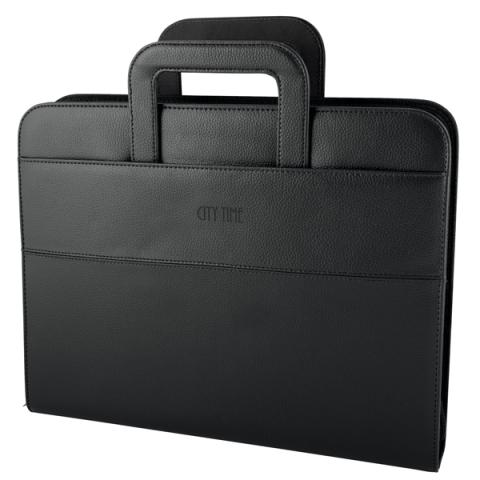 Descrizione / dati tecnici: Portablocco in similpelle morbido colorato. Interno in tessuto a righe, chiusura con cerniera e dotato di manici rientranti. Varie tasche interne, 4 anelli metallici Ø3.5cm e completo di blocco.