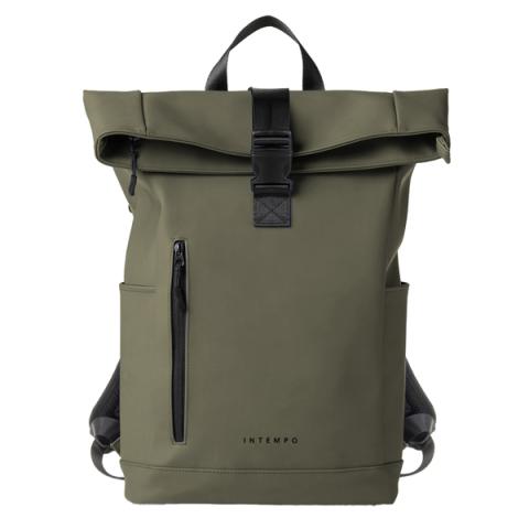 Descrizione / dati tecnici: Zaino Roll-top realizzato con materiale gommato resistente all'acqua e idrorepellente. Dotato di grande vano centrale e tasce laterali. Chiusura superiore con zip e moschettone. Incluso guscio porta notebook 15".