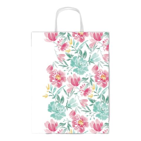 Descrizione / dati tecnici: Shopper regalo realizzato in carta kraft bianco con stampe a colori. Dotato di manici in carta ritorta. Assortimento di 5 differente fantasie.