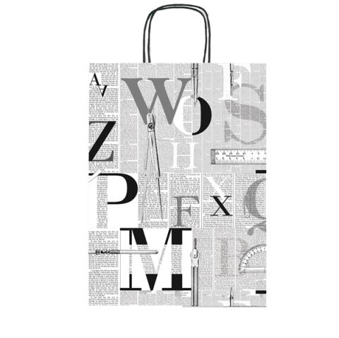 Descrizione / dati tecnici: Shopper regalo realizzato in carta kraft bianco con stampe a colori. Dotato di manici in carta ritorta. Assortimento di 5 differente fantasie.
