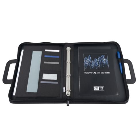 Descrizione / dati tecnici: Portablocco in tessuto bicolore. Chiusura con cerniera. Tasca interna con vari scomparti. 4 anelli metallici diam. 3mc. Manici rientranti. Completo di blocco.