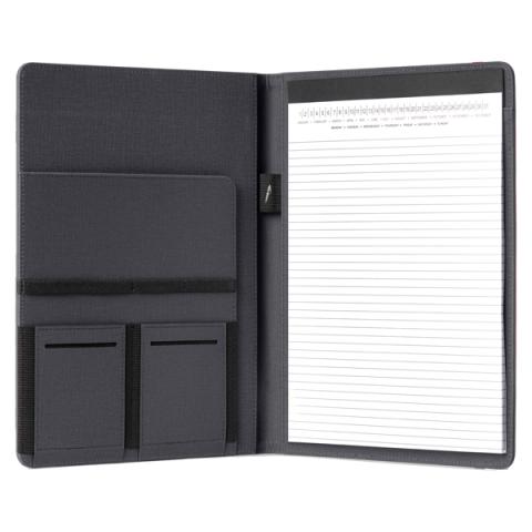 Descrizione / dati tecnici: Cartella portablocco con elastico. Copertina con frontale antiscivolo. Dotata di aletta portadocumenti, tasche elastiche, asola portapenne e blocco notes A4.