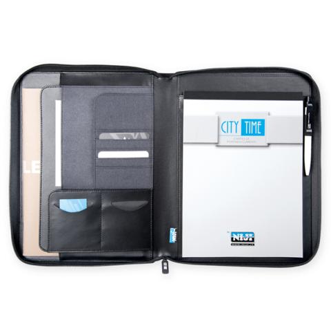 Descrizione / dati tecnici: Portablocco in tessuto bicolore. Chiusura con cerniera. Tasca interna con vari scomparti. Completo di blocco. Dimensioni: 26x34cm