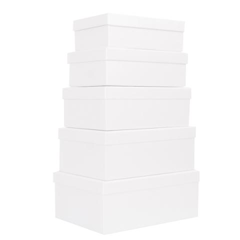 Descrizione / dati tecnici: Robuste e colorate scatole in cartone spessore 2mm. Rivestite in carta da 170gr/m2 stampata in offset e incollata a caldo. Il set è composto da 5 scatole, una per ogni misura: 14x21x6cm, 16x23x7cm, 17x24x8cm, 18,5x25x5x9cm, 20x27x10cm.