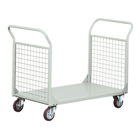 Descrizione / dati tecnici: Carrello con pianale in lamiera e 2 sponde in tubo e rete con maglia 5x5x0,4cm, ruote 14cm con cuscinetti a rulli, 2 fisse e 2 girevoli. Portata 300kg. Verniciatura a polvere grigio RAL 7038. Dimensioni carrello: 138Lx66Px20/96Hcm. Dimensioni pianale: 110Lx65Hcm. Fornito smontato.