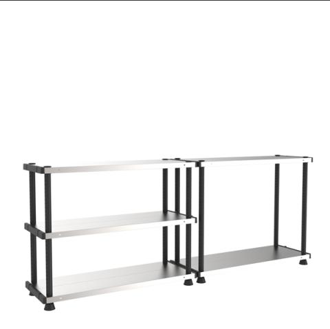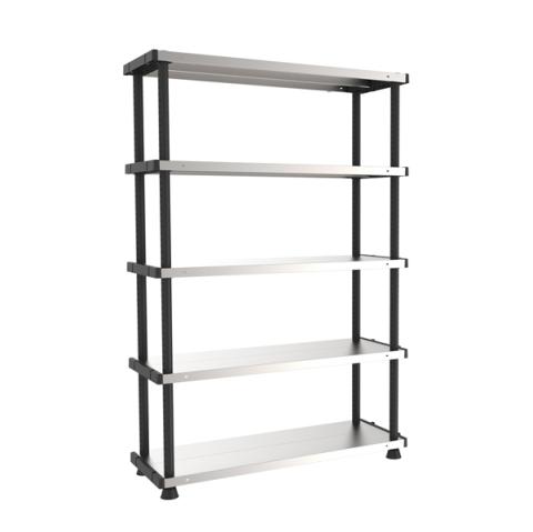 Descrizione / dati tecnici: Scaffale composto da 4 montanti verticali in plastica nera con piedini regolabili in altezza. 5 ripiani in metallo regolabili con profondità di 45cm con portata massima di 120Kg per ripiano. Montaggio dello scaffale stimato in 10". Possibilità di fissaggio a parete.