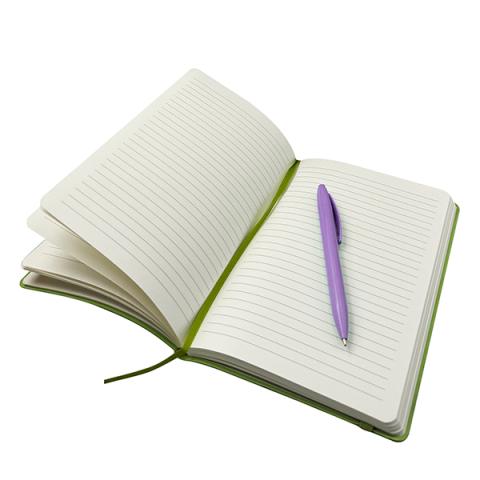 Descrizione / dati tecnici: Taccuino con copertina morbida e tasca interna a soffietto. Dotato di elastico esterno e segnapagina coordinato al colore della copertina. Carta avoriata rigata da 70gr. 5 colori assortiti: nero, giallo, verde chiaro, fucsia e celeste. Confezionato singolarmente in cellophane.