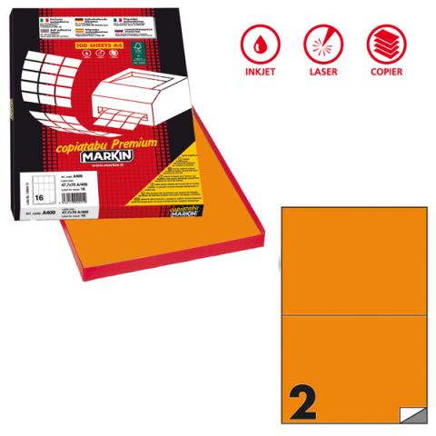 Etichette adesive C/509 - in carta - permanenti - 210 x 148,5 mm - 2 et/fg - 100 fogli - arancio fluo - Markin