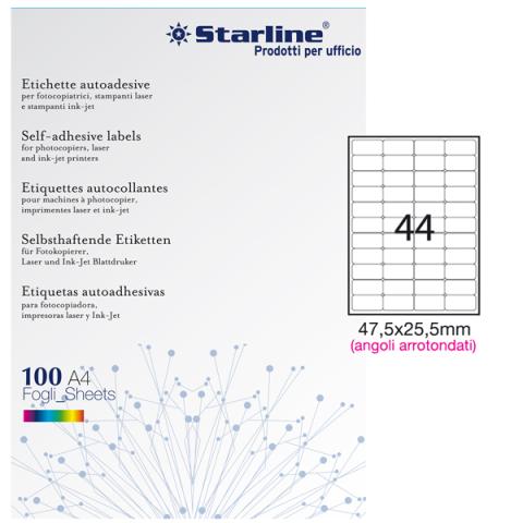 Etichette adesive - in carta - angoli arrotondati - permanenti - 47,5 x 25,5 mm - 44 et/fg - 100 fogli - bianco - Starline