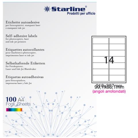 Etichette adesive - in carta - angoli arrotondati - permanenti - 99,1 x 38,1 mm - 14 et/fg - 100 fogli - bianco - Starline