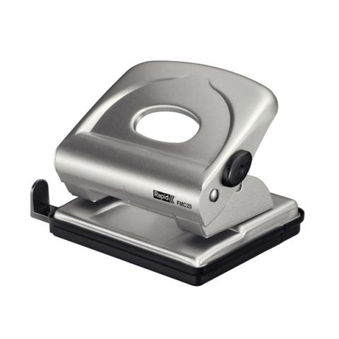 Descrizione / dati tecnici: Perforatore FMC25+ a 2 fori passo 8cm con guida regolabile. Struttura in metallo e base removibile per la raccolta degli sfridi. Dotato di dispositivo di bloccaggio salvaspazio per la leva di perforazione. Foro da 5,5mm.