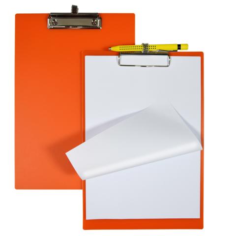 Descrizione / dati tecnici: Porta blocco semplice in PP opaco riciclato e riciclabile. Con molla in acciaio dotata di portapenna estendibile. Disponibile in 4 colori assortiti: azzurro,arancione, verde e rosso.