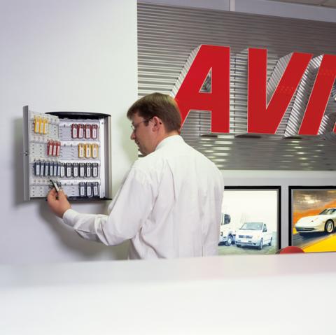 Descrizione / dati tecnici: Cassetta portachiavi da muro. Realizzata in alluminio con capacità di 72 chiavi. Lo sportello si apre a più di 90 gradi per facilitare l'accesso alle chiavi. Chiusura con serratutra e 2 chiavi numerate che possono essere sostituite in caso di perdita o rottura. I particolari pannelli interni permettono alle barre portachiavi di essere agganciate all'altezza desiderata assicurando un'alta versatilità di gestione. Include 6 portachiavi art.1957 in colori assortiti. Dimensioni: 30,2x11,8x40cm.