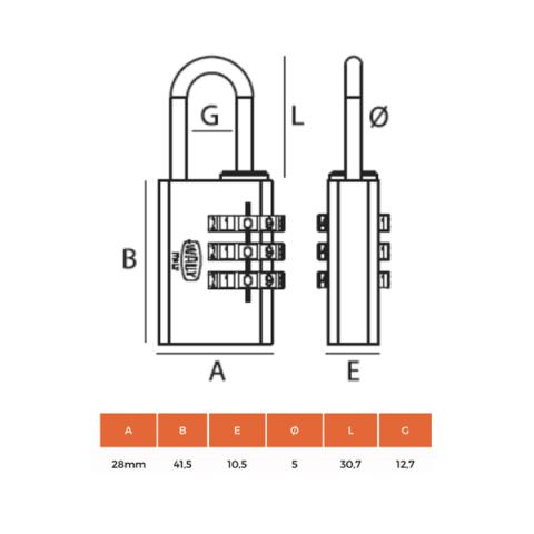 Descrizione / dati tecnici: Lucchetti dal corpo in ottone e arco in acciaio tempreto. Combinazione a a 4 pomelli. Confezione in blister. Dimensione: H 41,5 x L 28mm, Altezza complessiva (arco incluso) 69,5mm