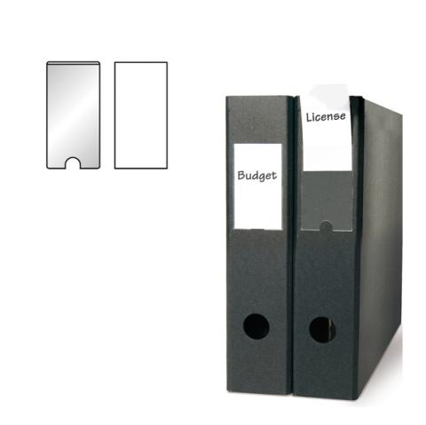 Descrizione / dati tecnici: Portaetichette in polipropilene autoadesivi, permanenti e trasparenti, dotati di etichette di carta scrivibili, stampabili e intercambiabili. Comoda apertura a semicerchio che permette di inserire e rimuovere agevolmente gli inserti. Ideali per contrassegnare in modo semplice e rapido raccoglitori, registratori, archivi, ecc... Formato 55x150 mm.