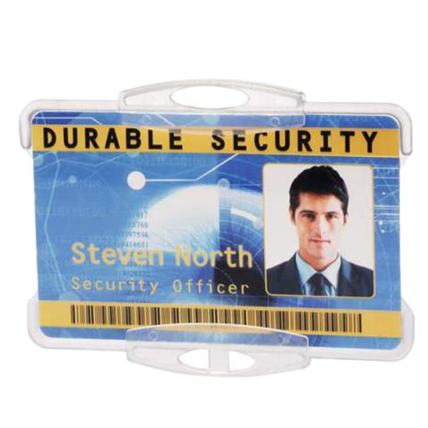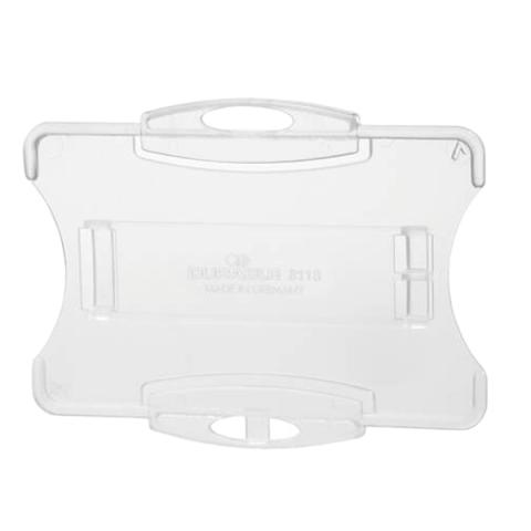 Descrizione / dati tecnici: Portanome in polistirene rigido, aperto per agevolare l'eventuale lettura di chip a radiofrequenza o timbratura, utilizzabile sia orizzontalmente sia verticalmente, agganciabile.