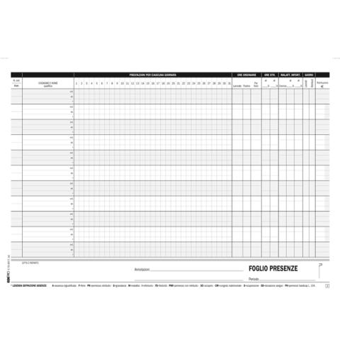 Descrizione / dati tecnici: BLOCCO PRESENZE MENSILI. Formato 21 x 30cm. 50 fogli. 2 copie ric.