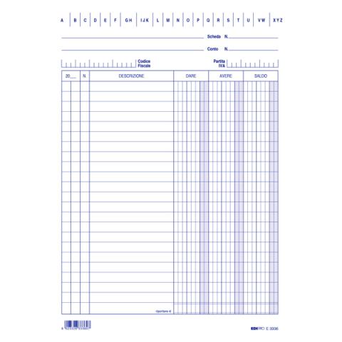 Descrizione / dati tecnici: 100 schede in cartoncino da 170gr. Formato 21x15cm verticale. Dare/avere/saldo.