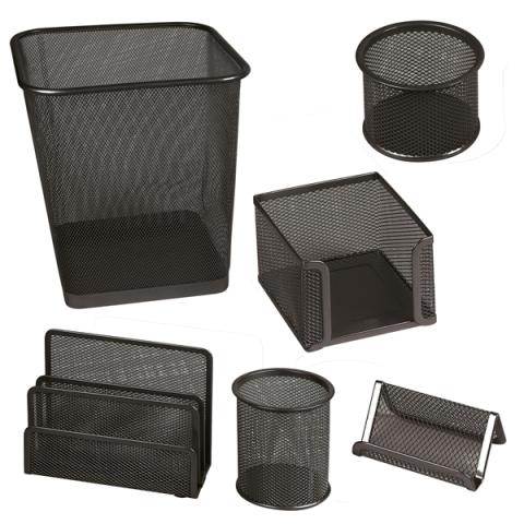 Descrizione / dati tecnici: Set scrivania in rete metallica, composto da 6 accessori: sparticarte, cubo portamemo, portapenne, portafermagli, portabiglietti da visita e cestino gettacarte.