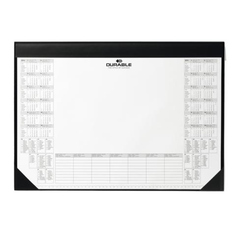 Descrizione / dati tecnici: Sottomano rettangolare dotato di 25 fogli con calendario biannuale multilingue, festività nazionali e sezione settimanale utile per appunti. Dimensioni 59x42cm, di colore nero.