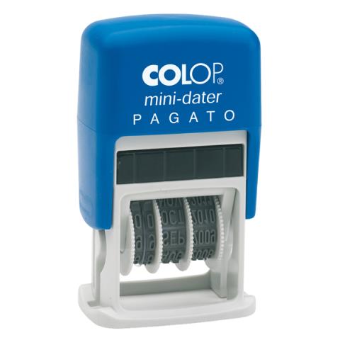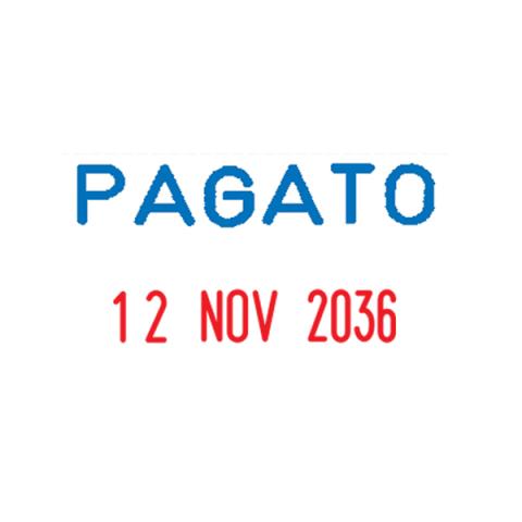 Descrizione / dati tecnici: Timbro mini datario con dicitura fissa PAGATO con caratteri alti 4mm. Fusto antiurto in ABS. Tampone preinchiostrato bicolore blu/rosso (cod 38126). Tampone ricambio nero E/10 (cod 38117).