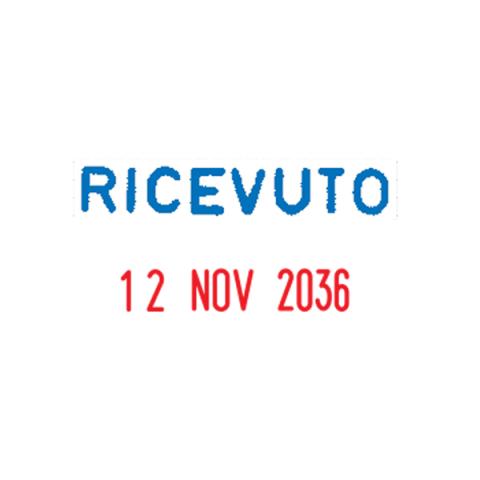 Descrizione / dati tecnici: Timbro mini datario con dicitura fissa RICEVUTO con caratteri alti 4mm. Fusto antiurto in ABS. Tampone inchiostro bicolore blu/rosso (cod 38126). Tampone ricambio nero E/10 (cod 38117).